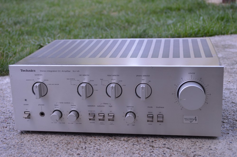 Amplificator Technics SU-V6: 5 intrari, impedanta 4-16 ohmi, 4 iesiri, 760 W consum din retea, 2 radiatoare, traf mare, mufe aurite, 4 condensatori filtraj, reglaje bass, treble, balance, subsonic high filter, loudness, new class A, Phono selector, prezinta mici zgarieturi, suna foarte bine, made in Japan.