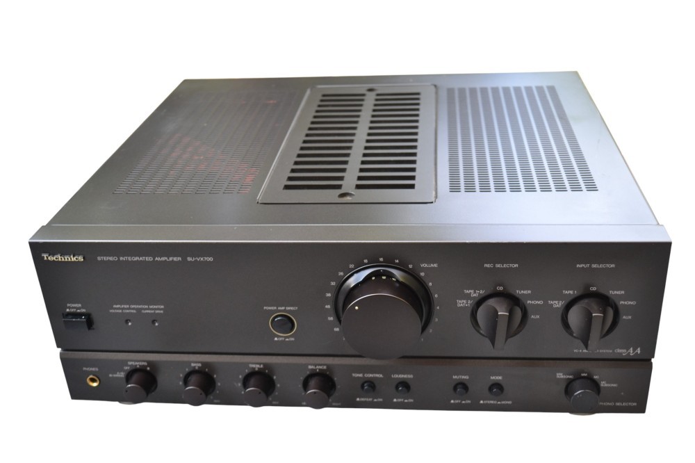 Amplificator Technics SU VX 700 : 7 intrari, 4 iesiri, impedanta 4-16 ohmi, bi-wiring, 690 W consum din retea, loudness, muting, Phonoselector, butonul de phono selector nu este cel original, class AA, VC 4 Amplifier, finali tranzistori, Power Amp Direct, poze reale, made in Japan.