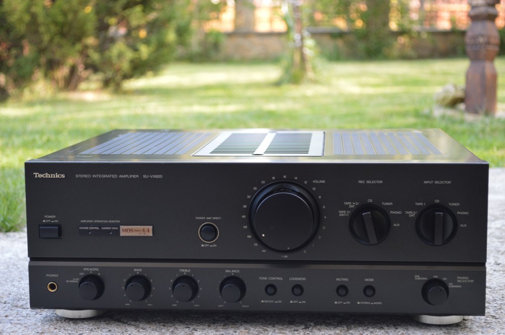 Amplificator TECHNICS SU-VX 820: 7 intrari, 4 iesiri, impedanta 4-16 ohmi, reglaje bass, treble, balance, loudness, muting, phono selector, se poate lega si BI-WIRING, MOS class A, made in Japan, 320W consum din retea, suna foarte bine. Arata bine.