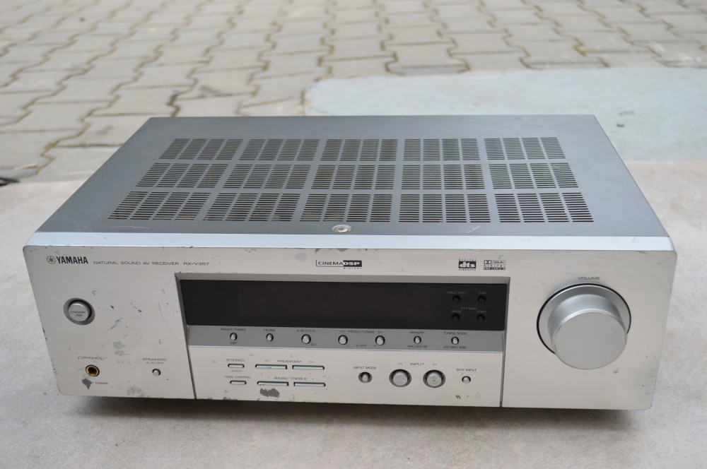 Amplificator Yamaha RX-V357: 6 intrari, 7 iesiri, 4 iesiri pe stereo, impedanta 6-16 ohmi, 240 W consum din retea, optical+coaxial input, culoare argintie, afisaj central, reglaje bass, treble, balance, Cinema DSP, DTS, DolbyDIgital, Prologic II, radio cu RDS, EON, PTY, multiple memorii, senzor de telecomanda, mici zgarieturi.