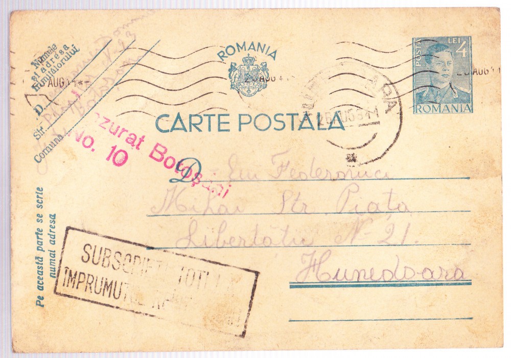 AMS# - CARTE POSTLA CENZURAT BOTOSANI - NR. 10, 1941