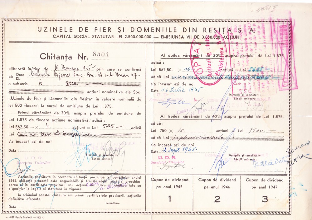 AMS - CHITANTA ACT. NOMINATIVE SOC. UZINELE DE FIER SI DOMENIILE RESITA 1945