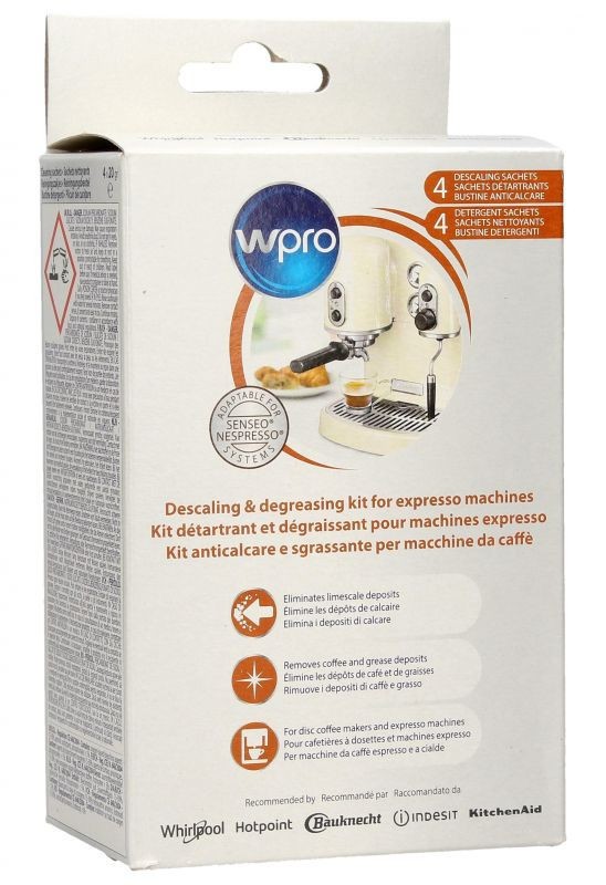 Kit de curățare Express O² 4 plicuri de decalare ale mărcii WPRO. Express02 este o formulă bazată pe oxigen activ, special concepută pentru degresarea și descalțarea păstăilor sau a mașinilor automate de cafea și espressoare.Contine: 4 descărcătoare de pliculețe care eliberează oxigen activ sub formă de micro bule.1 pachet = 4 luni întreținere. Restabilește dispozitivul performanțele sale originale și tristețea prelungită a vieții. Păstrează aroma cafelei.