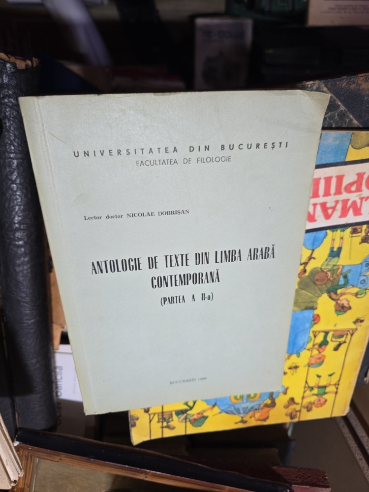 Editura: Universitatea din București, Facultatea de FilologieAnul aparitiei: 1980Numar de pagini: ,Autor: Nicolae DobrișanISBN: Această antologie oferă o selecție variată de texte scrise î,n limba arabă contemporană, avâ,nd scopul de a familiariza cititorii cu diverse stiluri și teme ale literaturii arabe moderne.