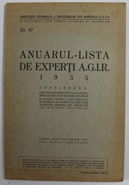 ANUARUL - LISTA DE EXPERTI A.G.I.R. , 1935