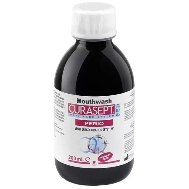 Curasept ADS Perio este creata pentru pacienti cu gingivite sau cu afectiuni parodontale. Concentratia de 0,12 % clorhexidina alaturata de PVP-VA si HA, s-a dovedit a fi eficace atat in durerea post-chirurgicala cat si in tratamente nechirurgicale. Efectul apei de gura Curasept ADS Perio este mentinut pe termen lung, aceasta formand un film protector pentru gingii, oprind formarea placii bacteriene. Concentratia moderata de Clorhexidina reduce efectele secundare. Beneficii: ∘ Acidul hialuronic ajuta regenerarea tesuturilor; ∘ PVP-VA formeaza un film protector pe membranele mucoaselor, gingiilor si dintilor; ∘ Clorhexidina in concentratie medie 0.12%; ∘ ADS pentru mai putine efecte secundare neplacute; ∘ Grad inalt de toleranta; ∘ Apa de gura nu contine alcool. Indicatii: ∘ Promoveaza vindecarea ranilor parodontale: terapie parodontala nechirurgicala de tip cauzala cu sau fara scaling(ultrasunete sau manual); ∘ O operatie simpla parodontologica cu sau fara extractie; ∘ Un tratament selectiv pentru pungile parodontale; ∘ Pentru o dezinfectare a intregii cavitati bucale; ∘ In caz de gingivita; ∘ Pentru a completa igiena orala realizata zilnica de catre pacientii cu boli parodontale. Pachetul contine: ∘ 1 Flacon de 200 ml.
