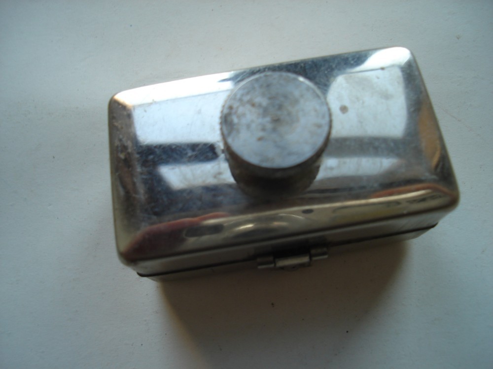 Aparat ascutit lame de ras, probabil incomplet, ii lipseste pe o parte accesoriul spongios (nu e burete), in rest e OK. Cutiuta are 5.5x3x2.2 cm. Nu stiu cum se folosea.