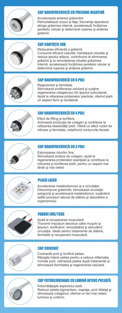 Ideală pentru tratamente faciale și corporale – redă fermitatea pielii, reduce ridurile, combate laxitatea cutanată și oferă un efect de întinerire vizibil. - EMS (electrostimulare musculară)