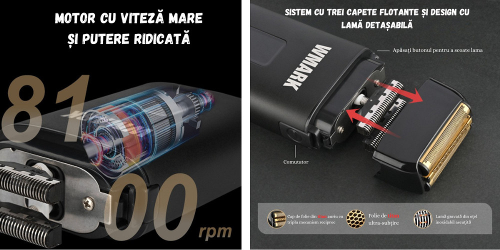 Aparat de ras cu motor de 8100 rpm, trei capete flotante si lama detasabila pentru o curatare usoara. Folia din titan ultra-subtire si lama din otel inoxidabil asigura un barbierit precis si confortabil.