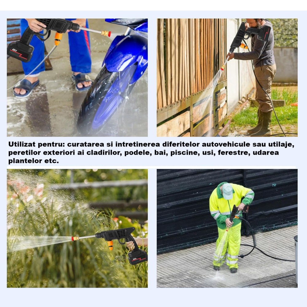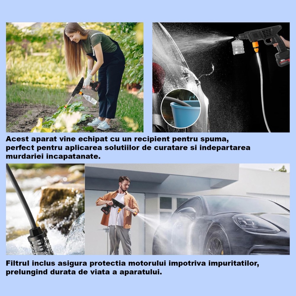Aparat De Spalat Cu Presiune GREATON Tip Pistol, Doi Acumulatori Reincarcabili, Maner Ergonomic, Recipient Spuma, Filtru, Furtun Incluse, 3 Moduri De
