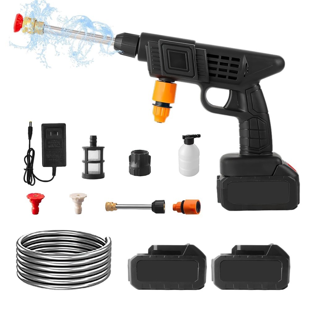 1 x Aparat De Spalat Cu Presiune GREATON Tip Pistol, Doi Acumulatori Reincarcabili, 25 Bar, Maner Ergonomic, Recipient Spuma, Filtru, Furtun Incluse, 3 Moduri De Spalare Diferite, Geanta De Transport Inclusa, Negru.