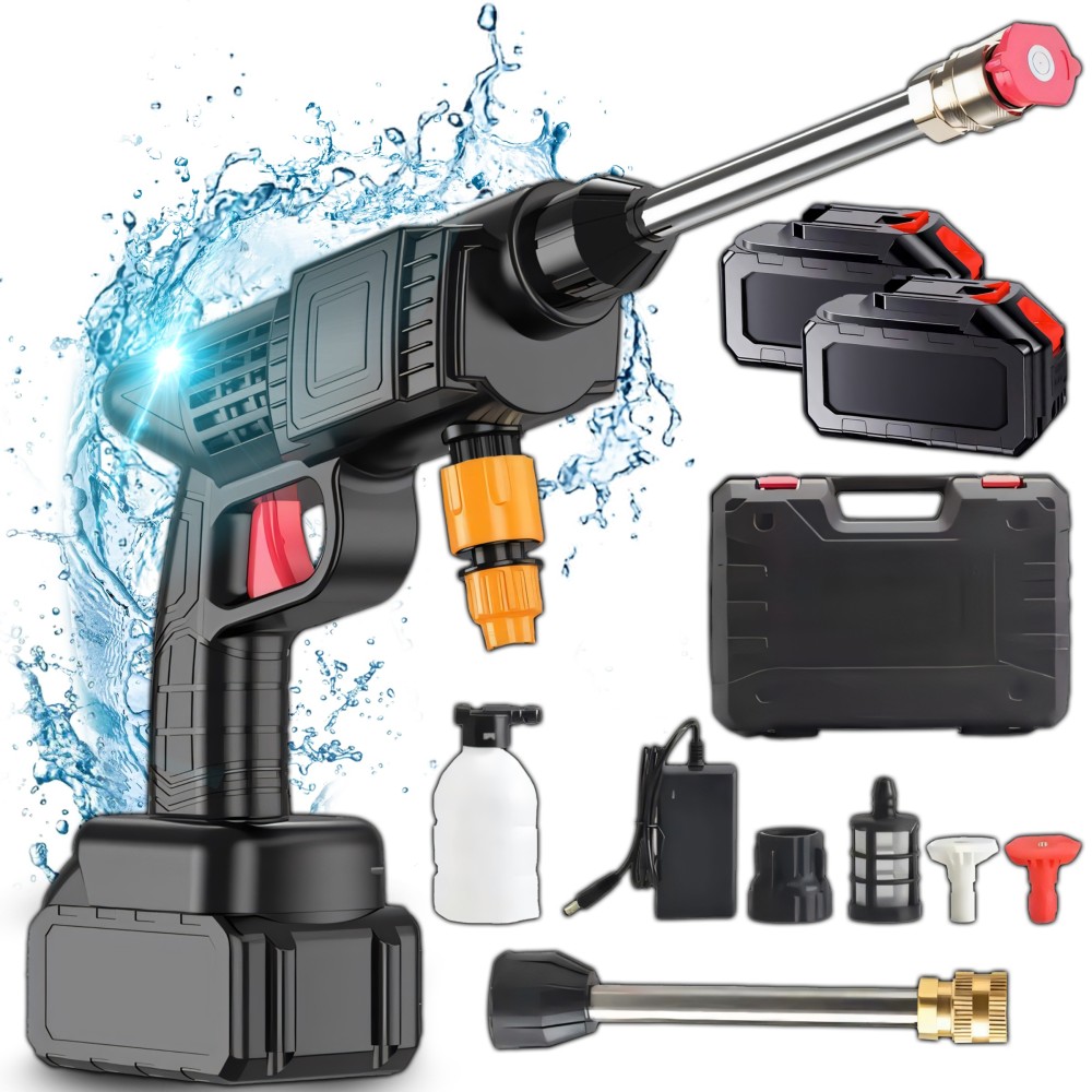 Aparat de Spalat cu Presiune Portabil, RETOO TechPro, Tip Pistol, 40 BAR, 250L/h, cu 2 Acumulatori 68V, Furtun 5m cu Filtru, 2 Duze Interschimbabile si Recipient pentru Spuma, pentru Spalarea Masinii, Utilizarea in Casa si Udarea Gradinii, Negru-Rosu