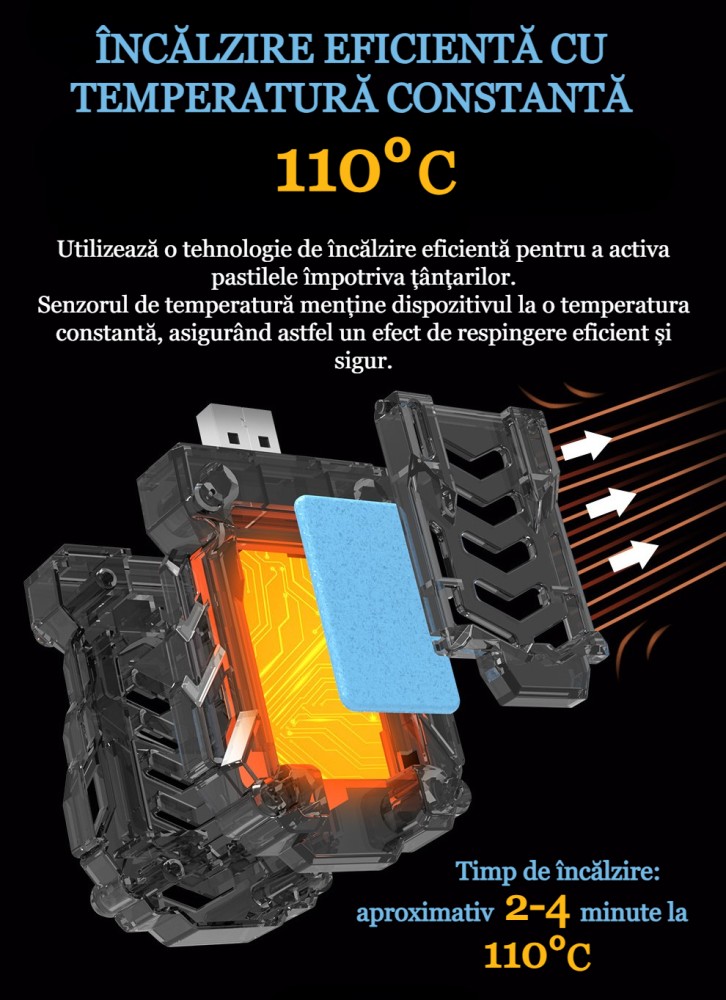 Tehnologie inovatoare: Dispozitivul portabil impotriva tantarilor utilizeaza tehnologie de incalzire eficienta la 110°C pentru a activa tabletele repelente, oferind o solutie rapida si eficienta impotriva tantarilor.