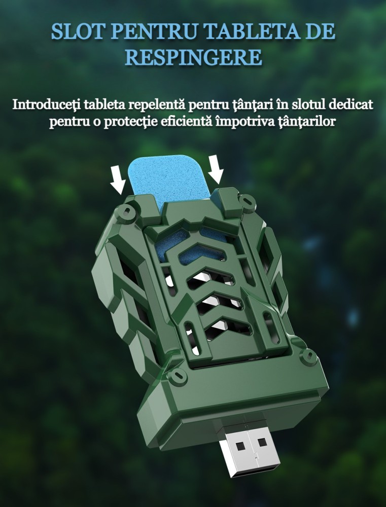 Aparat electric portabil ipotriva tantarilor cu pastile, Interior/Exterior, Alimentare prin USB sau baterie externa, compact si usor 33g, protectie 360°, Potrivit pentru Camping sau Casa, Verde
