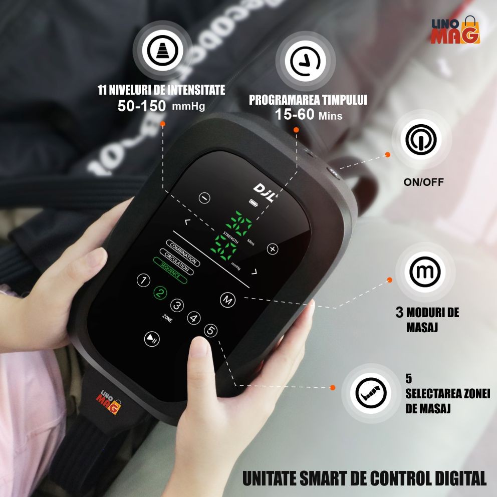 Răspuns 1: Acesta este un dispozitiv de compresie cu 5 camere de aer (la nivelul piciorului, gambei inferioare, gambei superioare, coapsei inferioare și coapsei superioare) se umflă și se dezumflă într-o secvență sofisticată care simuleaza masajul manual al unui terapeut. Acest tip de masaj maximizează circulația sângelui în întregul corp, reduce durerea și oboseala musculară în zonele tratate, ajuta drenarea limfatică, reduce inflamatia la nivelul picioarelor, ajuta la recuperarea mai rapida dupa un efort fizic intens.