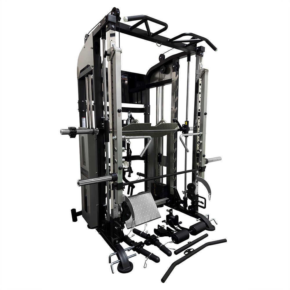 Tijele de ghidare pentru contragreutate cu rulmenti de inalta clasa permit o miscare lina si un antrenament sigur. Datorita opritoarelorde siguranta, nu veti avea nevoie de un partener de sparring. Si puteti face mult mai mult decat doar ridicari, genuflexiuni si indreptari. Aparatul are, de asemenea, o placa de presa picioare, asa ca daca detineti o banca de exercitii, puteti lucra cu adevarat la coapsele si gambele dvs.!