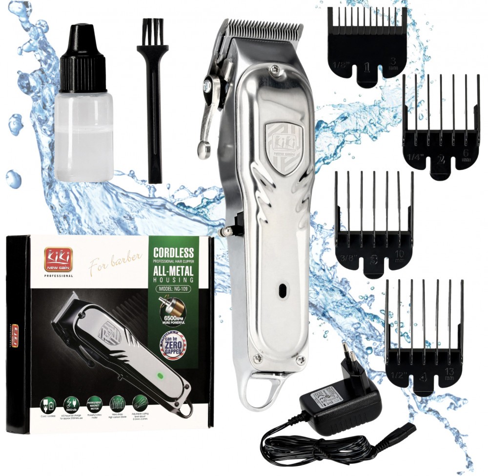 Mașina de tuns are lame din inox, o baterie încăpătoare care permite aproximativ 250 de minute de lucru și o gaură pentru agățat pe cârlig.