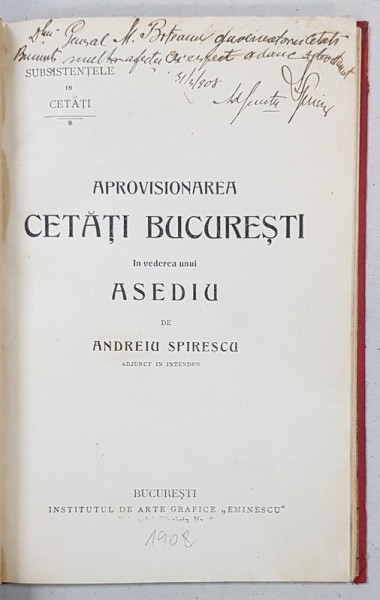 APROVISIONAREA CETATI BUCURESTI IN VEDEREA UNUI ASEDIU de ANDREIU SPIRESCU - BUCURESTI, 1908 *DEDICATIE