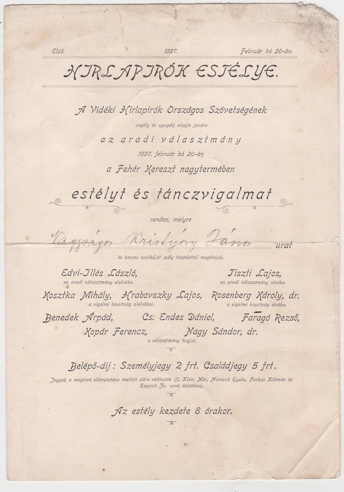 Arad Serata Ziarelor Rurale in marea sala a Crucii Albe Seara si dans 1897