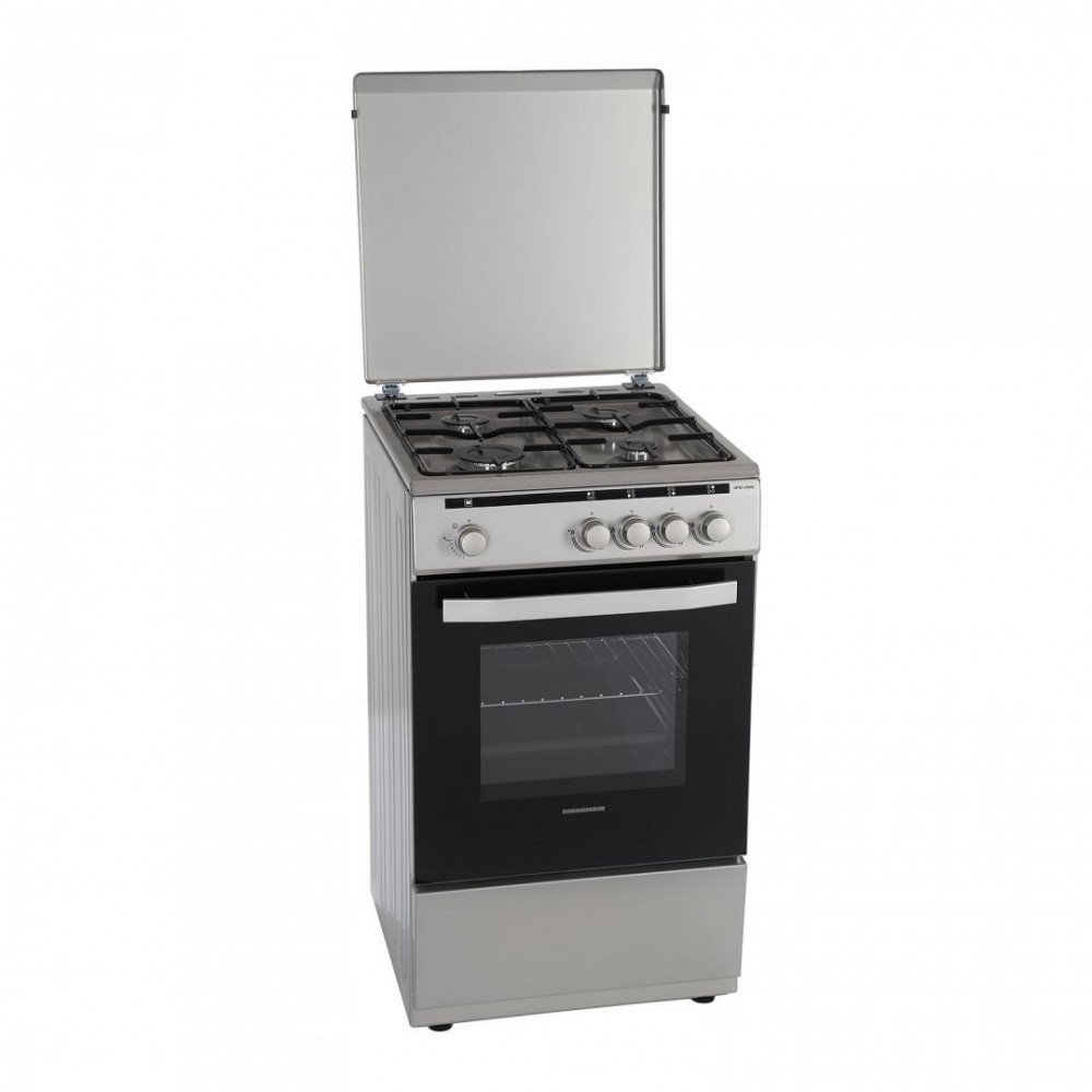 Aragaz Gaz Heinner HFSC-V50SL, 50x50cm, 4 arzatoare gaz, Suport email, Capac metalic, Dispozitiv de siguranta plita si cuptor, Usa cuptor cu geam dublu, Duze GPL incluse, Tava si gratar cromat, Dimensiuni ( LxAxI): 50x49.5x85 cm, Culoare: Argintiu