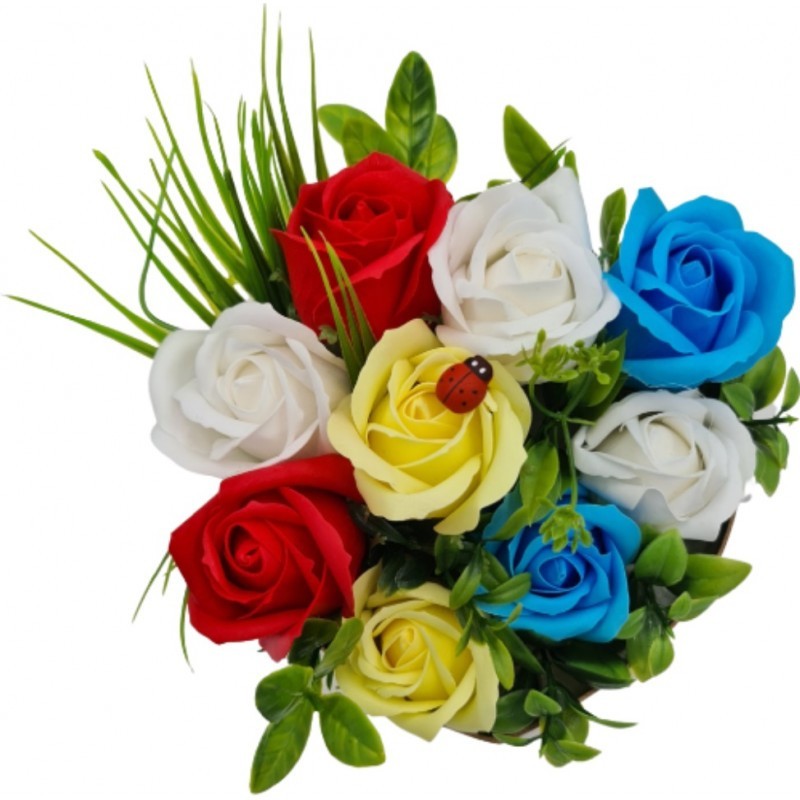 Aranjament floral deosebit 9 trandafiri cutie , flori de sapun,buburuza, 15x15x15 cm