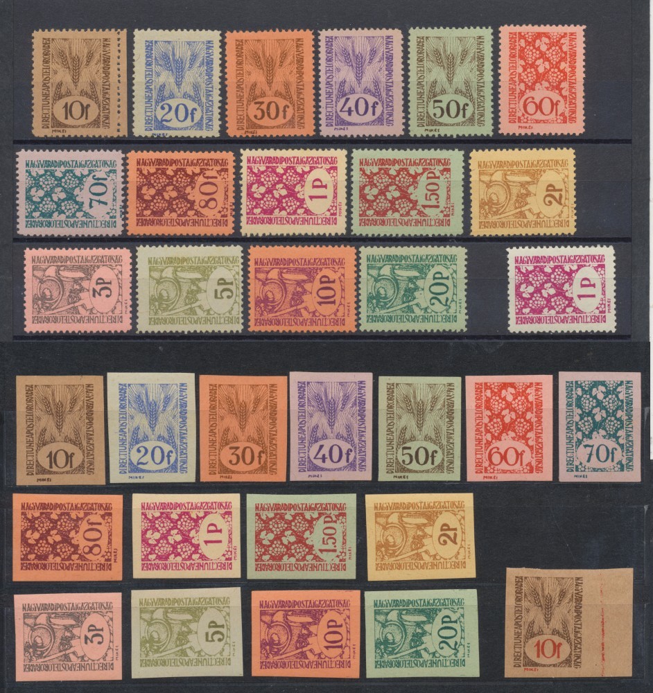Ardealul de Nord 1945 emisiunea locala Oradea II set complet 15 dantelate & 15 nedantelate & doua erori, MNH. Setul include eroarea de 10 Filler nedantelată cu cifre rosii, plus eroarea de 1 Pengo dantelata tipărită pe hârtie albă.