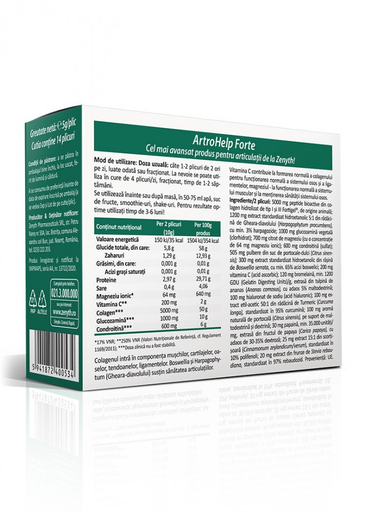 De ce sa alegi acest produs: Produs natural, 100% ingrediente active . Formula unica 6 in 1 pentru sanatatea articulatiilor. Complex inovator, ingrediente premium, optim dozate. Colagen hidrolizat Fortigel , ingredient patentat si studiat pentru actiunea pe sanatatea articulatiilor. 5000 mg colagen hidrolizat de tip I si III Fortigel (per doza zilnica 2 plicuri). Imbogatit cu acid hialuronic pentru un plus de mobilitate. Biodisponibilitate crescuta datorita enzimelor proteolitice. Poate fi consumat si de catre persoanele alergice la crustacee. Glucozamina din formula este de origine vegetala. Mentine elasticitatea si flexibilitatea articulatiilor. Reduce disconfortul articular. Sustine formarea si sinteza colagenului. Sub forma de pulbere cu gust placut de portocale . Plicuri monodoza (5 g). Usor de administrat si de luat la birou sau in calatorie. Fara gluten, soia, lactoza, arome, indulcitori sau aditivi chimici. Ce contine ArtroHelp Forte, 14 plicuri? 100% natural, 100% ingrediente active ArtroHelp Forte este un complex inovator pentru ingrijirea articulatiilor! Cu ingrediente de ultima generatie, optim dozate, ArtroHelp Forte contribuie la mentinerea elasticitatii si flexibilitatii articulatiilor, la reducerea disconfortului articular si la redarea mobilitatii articulare. Ingrediente 2 plicuri (10 g produs): 5000 mg peptide bioactive din colagen hidrolizat de tip I si III Fortigel ; 1200 mg extract standardizat din radacina de Gheara-diavolului ( Harpagophytum procumbens), cu min. 3% harpagozide; 1000 mg glucozamina vegetala (clorhidrat); 700 mg citrat de magneziu (cu o concentratie de 64 mg magneziu ionic) ; 600 mg condroitina (sulfat); 505 mg pulbere din suc de portocala ; 300 mg extract standardizat din rasina de Boswellia serrata , cu min. 65% acizi boswelici; 200 mg vitamina C (acid ascorbic) ; 120 mg bromelaina, min. 1200 GDU (Gelatin Digesting Units) g, extrasa din ananas ( Ananas comosus) ; 100 mg hialuronat de sodiu (acid hialuronic); 100 mg extract din radacina de Turmeric ( Curcuma longa), standardizat in 95% curcumina; 100 mg aroma naturala de portocala; 30 mg papaina, min. 35.000 unitati mg, extrasa din papaya; 25 mg extract din scortisoara ( Cinnamonum zeylandicum verum ), standardizat in 10% polifenoli; 20 mg extract din frunze de Stevia rebaudiana, standardizat in 97% rebaudozid. 17% VNR; 250% VNR (Valori nutritionale de referinta, cf. Reg. 1169 2011). Colagen hidrolizat de tip I si III Caramizile din care sunt construite cartilajele articulare acesta este colagenul. In lipsa colagenului, articulatiile nu mai functioneaza corespunzator. ArtroHelp Forte este singurul produs pentru articulatii care contine colagen hidrolizat de tip I si III Fortigel , de origine animala, in doze optime pentru sanatatea articulatiilor. Potrivit studiilor, colagenul hidrolizat administrat pe cale orala se absoarbe la nivel intestinal si se acumuleaza in cartilajele articulare, determinand reducerea disconfortului articular si imbunatatirea functionarii articulatiei. Doza zilnica de ArtroHelp Forte iti furnizeaza 5000 mg colagen! Glucozamina si condroitina Glucozamina si condroitina sunt parte integranta a cartilajelor articulare, fiind produse in mod normal de organismul uman. In unele cazuri insa (suprasolicitarea articulatiilor, inaintarea in varsta) este nevoie de suplimentarea dietei cu glucozamina si condroitina, pentru a incetini degradarea articulatiilor si pentru a reda mobilitatea si flexibilitatea acestora. Doza zilnica de ArtroHelp Forte iti furnizeaza 1600 mg glucozamina (1000 mg) + condroitina (600 mg)! Acid hialuronic Acidul hialuronic este un foarte bun lubrifiant al articulatiilor. De altfel, cea mai mare cantitate de acid hialuronic din organism este concentrata in lichidul sinovial. Studiile au aratat ca administrarea de acid hialuronic reduce durerile la nivelul genunchilor, amelioreaza inflamatia, creste rezistenta musculara. In cazul pacientilor cu osteoartrita, durerea si rigiditatea articulatiilor s-au redus considerabil dupa administrarea prelungita (8-12 saptamani) de acid hialuronic. Doza zilnica de ArtroHelp Forte iti furnizeaza 100 mg acid hialuronic! Harpagophytum gheara-diavolului Excelent antiinflamator si analgezic, Harpagophytum (gheara-diavolului) ajuta la mentinerea sanatatii articulatiilor, ligamentelor, tendoanelor si muschilor. Harpagophytum este utila in reducerea disconfortului la nivelul articulatiilor, contribuind la recapatarea mobilitatii si flexibilitatii articulare. In plus, Harpagophytum este mai bine tolerata decat antiinflamatoarele de sinteza. Doza zilnica de ArtroHelp Forte iti furnizeaza 1200 mg Harpagophytum! Boswellia serrata Boswellia serrata este una dintre cele mai studiate plante pentru efectul sau de reducere a disconfortului articular. S-a demonstrat ca extractul de boswellia, standardizat in acid boswellic, poseda ef