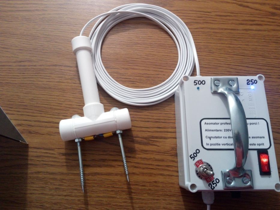 Aparat de asomare electric pt. porci conform normelor europene. Aparatul este unul profesional si de putere avand doua moduri de asomare pt. porci pana in 250kg si porci pana in 500kg. Aparat testat in fermele de porci cu cre?tere intensiva. Functionare ireprosabila. Se poate utiliza 24 din 24 fara sa se incalzeasca. Alimentare 220V, 50Hz. Siguranta de protectie la scurtcircuit. Comutator de sarcina mod de asomare. Posibilitate de vizualizare a tensiunii alese prin leduri. Usor de utilizat si de manipulat. ?epi cu striatii pt. mentinere. Toate operatiile de asomare le efectueaza o singura persoana. Foarte silentios in timpul asomarii. Carcasa robusta. Cablurile de alimentare respectiv de conexiune dintre aparat si furca sunt mentinute de presetupe fara a da voie intreruperii firului conductor. Furca rezistenta la socuri. Ca si functionare ireprosabila este garantat 10 ani. Mai multe relatii la telefon. Pretul nu este negociabil. VA ROG NU TRIMITETI MESAJE. Nu le pot citi la timp. Trimit in tara prin Posta Romana si/sau FanCourier. Va multumesc. .