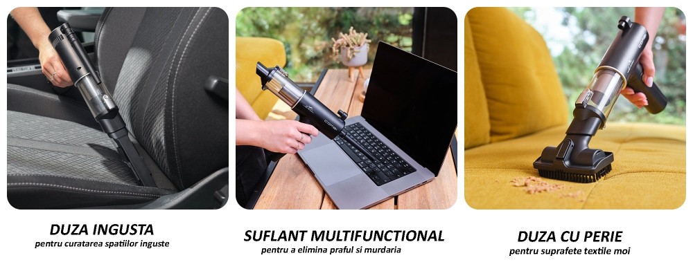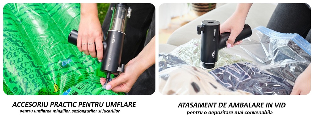 Acest aspirator compact si usor nu este destinat doar aspirarii clasice, ci permite si vidarea pungilor pentru haine, precum si umflarea saltelelor, a colacilor, mingilor si altor accesorii sportive. Datorita unui adaptor special, poate fi folosit si pentru intretinerea focului in seminee sau gratare, precum si pentru curatarea prafului din echipamente electronice sau din zone greu accesibile.