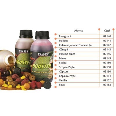 Pentru un plus de atractivitate este recomandat sa folosesti un atractant suplimentar pentru pelete, boilesuri, pasta de carlig. Booster de la firma Traper se prezinta in flacoane de 300ml si este disponibil in trei variante: ficat, canepa sau energy. Poate fi folosit cu incredere si la saculetii de nadire, acest atracant nu dizolva pungile de PVA.