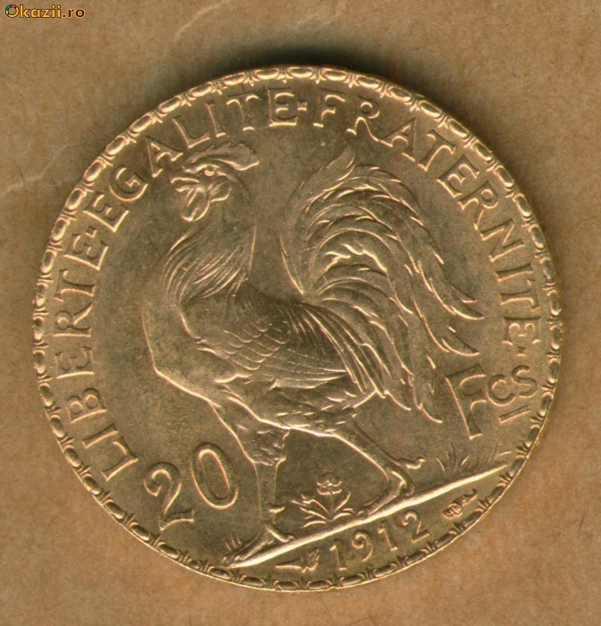 Vestitul cocosel,tezaurizat de romani in perioada interbelica si confiscat apoi de puterea comunista. Cocoseii au fost emisi intre 1899(anul de batere din care se mai gasesc foarte greu acum cocosei)si 1914. Cocoselul este batut din aur de 22 carate(titlu 900),6,45 grame,diametru 21 mm. Moneda este cea din poza,an de batere 1912,stare excelenta.