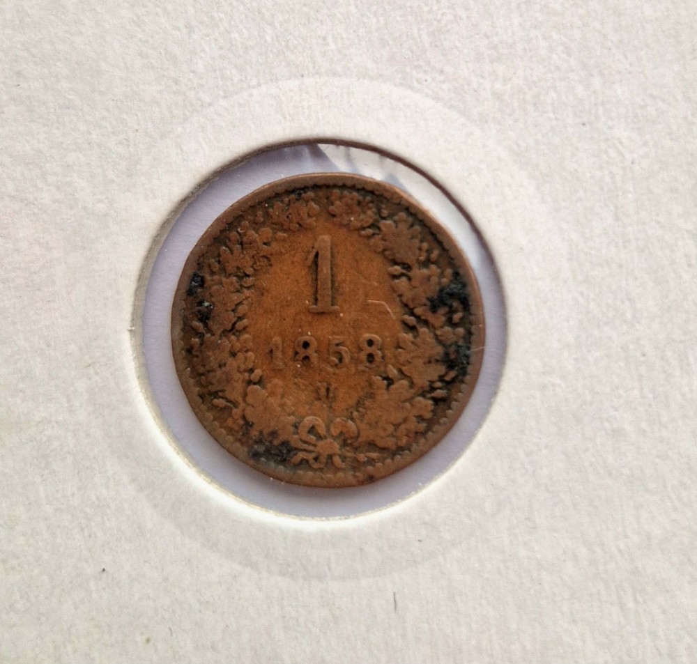 Austria 1 Kreuzer 1858 M moneda cupru km # 2186 Franz Joseph I tiraj mic