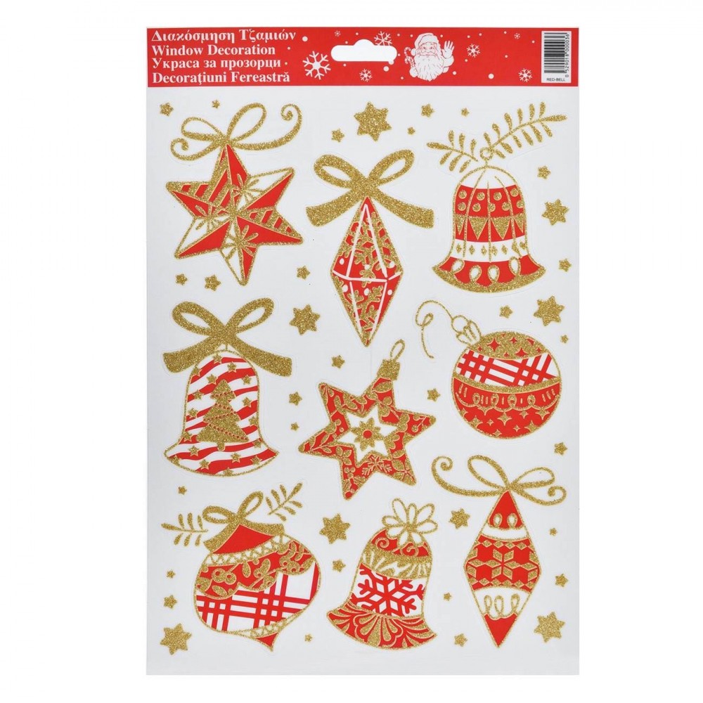 Autocolante Decorative Crăciun, Globuri Roșii cu Glitter Auriu, 20x30cm