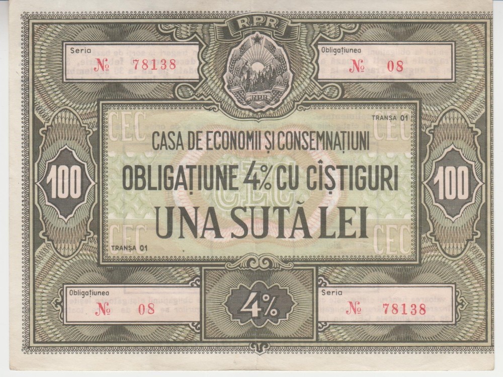 B11 111 - Bancnota foarte veche - Romania - Obligatiune CEC - 100 lei - Emisiune RPR