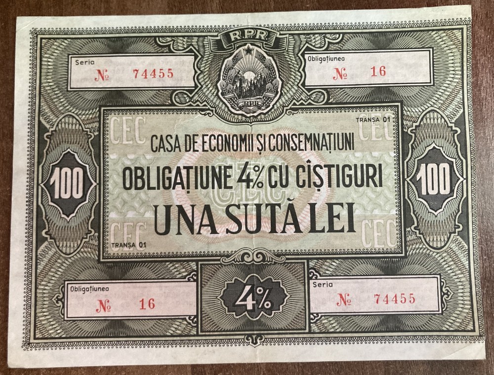 B11 112 - Bancnota foarte veche - Romania - Obligatiune CEC - 100 lei - Emisiune RPR