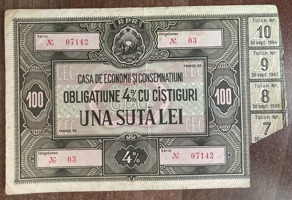B11 115 - Bancnota foarte veche - Romania - Obligatiune CEC - 100 lei - Emisiune RPR - cu taloane