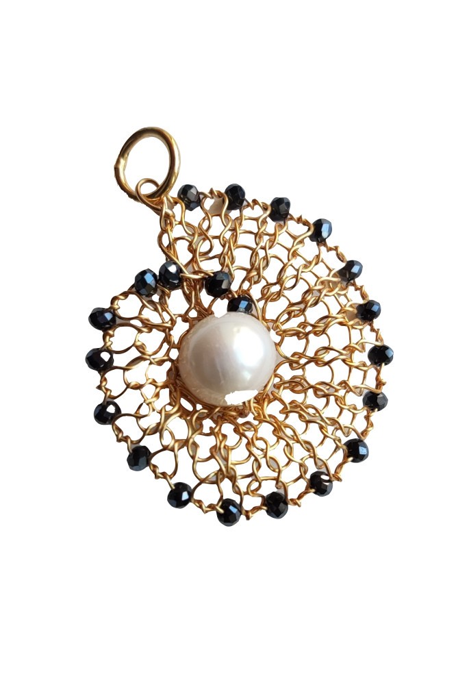 Pandantiv in cochilie crosetata in Cupru emailat cu email auriu - Gilt.Pietre: Cristale de sticla verde, perluta roz. Tehnica: Croseted wires.