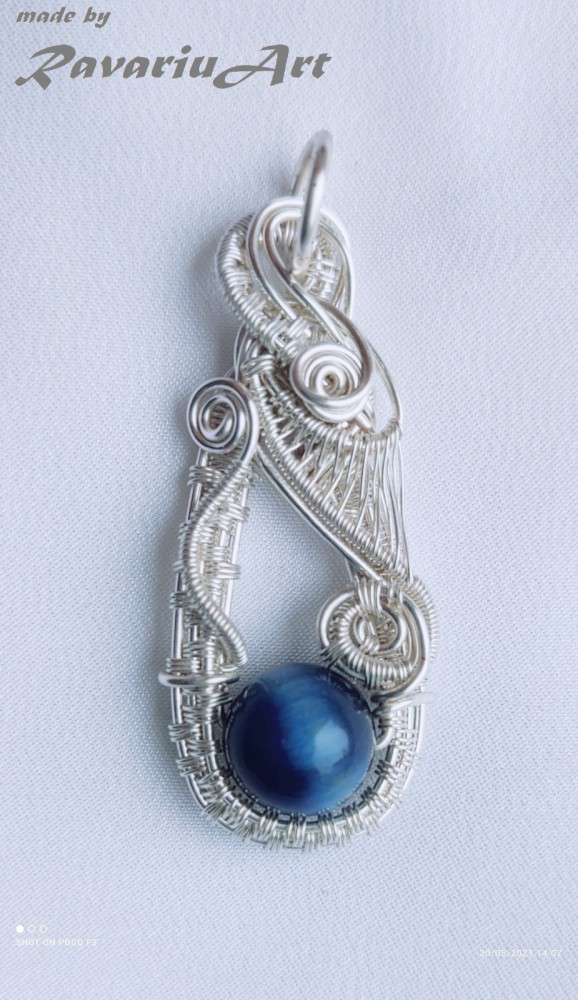 Pandantiv Ochi de tigru. Materiale folosite: fir metalic de gilt argintiu (aliaj pt bijuterii tratat anti-oxidare de provenienta Anglia), si Piatra semipretioasa: Ochi de tigru albastru, Tehnica: wires-wrapping.