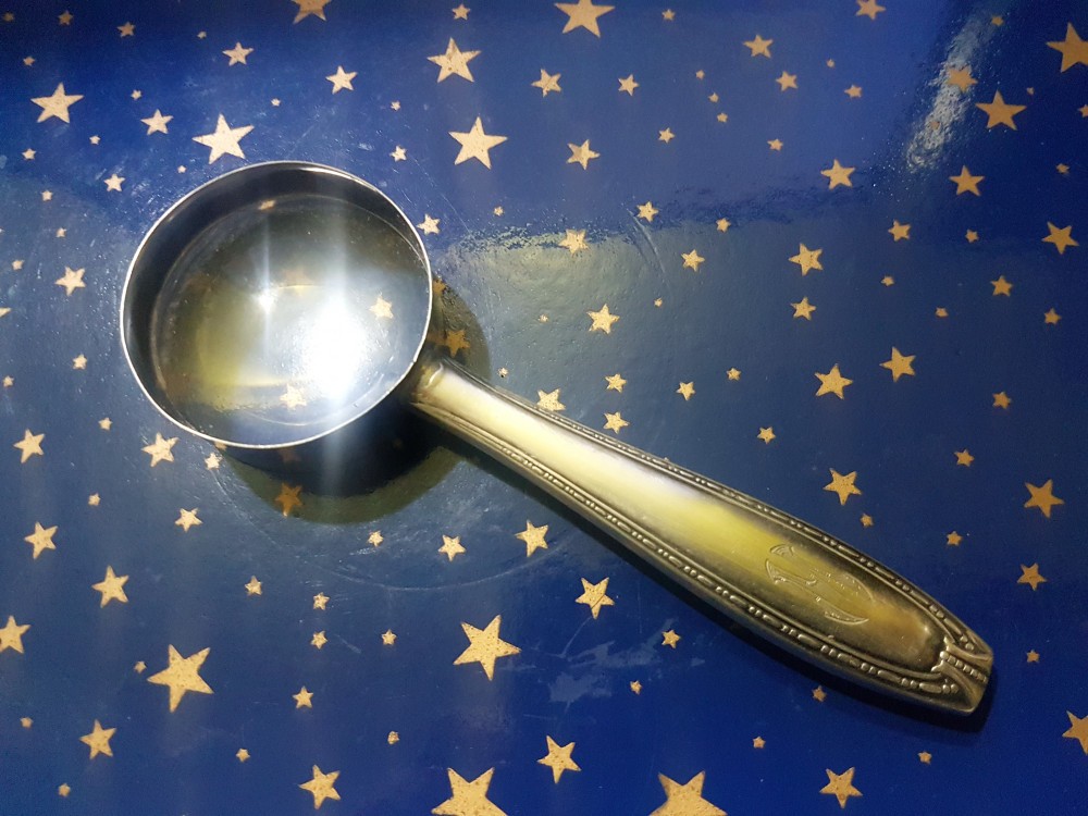 B791-Lupa Monograma M alpaca argintata veche anii 1900. Lungime 16 cm, diametrul 5.5 cm, latime lupa si maner 2.2 cm. Stare buna.