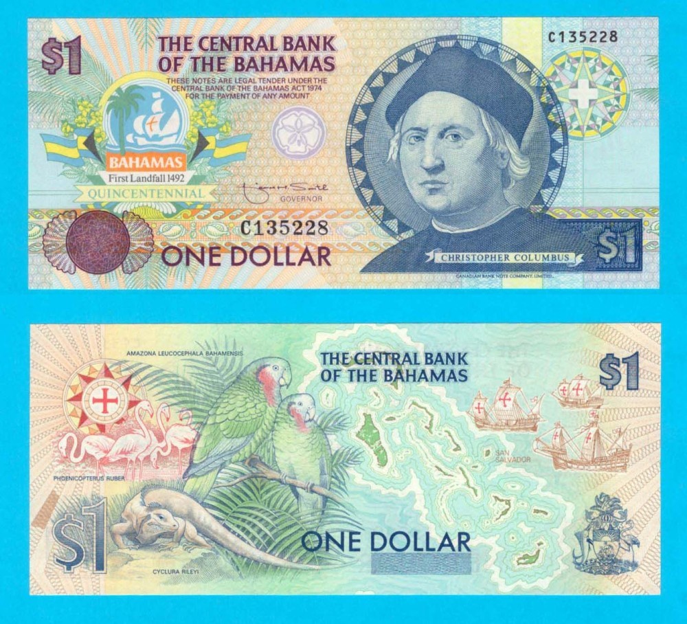 Bahamas (pick 50) 1 Dollar 1992 UNC serie: C135228 Comemorativă: Debarcarea lui Cristofor Columb; faţă: Cristofor Columb, Stema comemorativă; verso: Flamingo, Papagali Cubanezi, Iguana, Harta Bahamas, Trei corăbii; material: hârtie; dimensiuni: 156x67 mm;