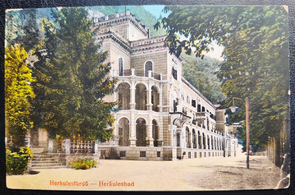 Baile Herculane 1915 - Herkulesfurdo - Rezso-udvar - printata, color, circulata, timbru maghiar supratipar, stampila speciala maghiara (cenzura ?)
