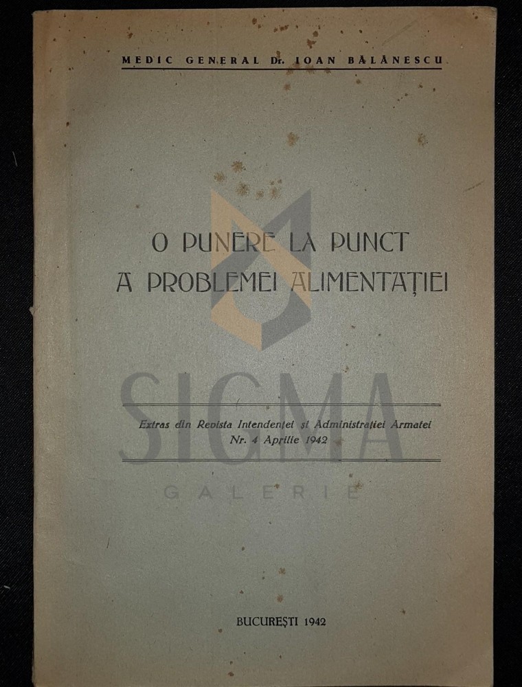 "O PUNERE LA PUNCT A PROBLEMEI ALIMENTATIEI" de IOAN BALANESCU Medic General, Doctor), 1942, Bucuresti, Extras din Revista Intendentei si Administratiei Armatei, Numarul 4, Aprilie 1942!, Exemplar Rarisim, In Format MEDIU (Brosat, 77 pagini, Dimensiuni: 23cm. x 15,5cm.), In Coperta Veche, Originala de Editura, Stare de Conservare: FOARTE BUNA.