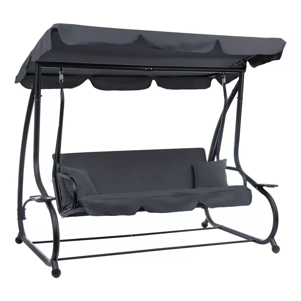 Balansoarul de grădină cu 3 locuri vă permite să vă relaxați alături de cei dragi în grădină sau pe terasă. Este echipat cu o copertină solară reglabilă care protejează eficient împotriva luminii solare. Poate fi ajustat optim în funcție de nevoile utilizatorului. Datorită funcției de pliere a scaunului utilizată în construcție, balansoarul vă permite să vă relaxați în orice poziție. Structura din oțel asigură stabilitatea și durabilitatea întregii piese de mobilier. Acoperișul, șezut și pernele sunt fabricate din poliester, care este mai rezistent la umiditate, fiind perfect pentru utilizare în exterior.
