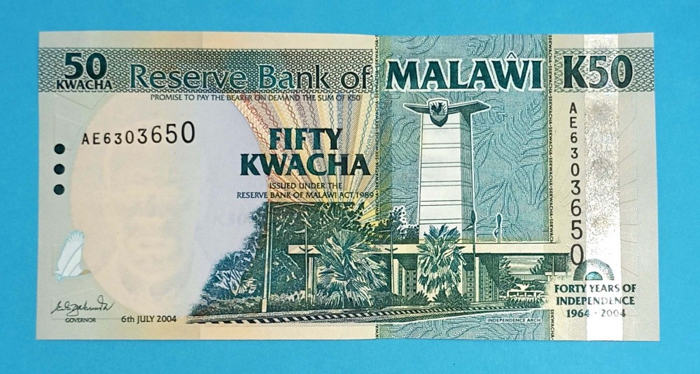 Bancnotă Malawi (pick 49) 50 Kwacha 2004 UNC serie: AE6303650 Comemorativă: 40 Ani de Independenta; faţă: Arcul Independenței, Blantyre; verso: Podul Mangochi; material: hârtie; dimensiuni: 144x72 mm;