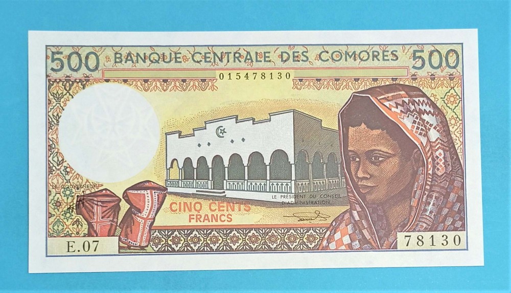 Bancnotă Insulele Comore (pick 10) 500 Francs 1984 UNC serie: E.07 78130 ; faţă: Cladire din Matsamudu, Femeie; verso: Femei cu fructe, plaja din Moheli ; material: hârtie; dimensiuni: 140x75 mm;