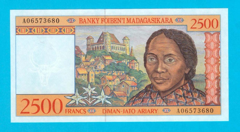 Bancnotă Madagascar (pick 81) 2500 Francs 1998 UNC serie: A06573680; 500 Ariary; faţă: Localnică, Rova din Manjakamiadana (Palatul Reginei din Antananarivo), trei flori de vanilie; verso: Două țesătoare, război de țesut, coșuri de in și rafie; material: hârtie; dimensiuni: 146x76 mm;
