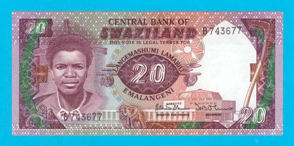 Bancnotă Swaziland (pick 12) 20 Emalangeni 1986 UNC serie: B7436.. ; faţă: Regele Mswati III, Clădirea Parlamentului; verso: Imaginea unei ferme; material: hârtie; dimensiuni: 150x69 mm;