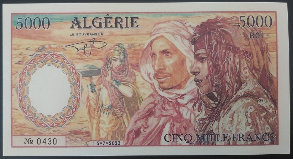 Bancnota fantezie in stare necirculata Algeria 5.000 Franci emisa in 2023.