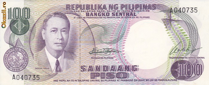 Bancnota in stare necirculata Filipine 100 Piso P144a (semnatura 7), parte din seria "Pilipino" emisa in 1969.