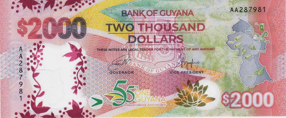 Bancnota comemorativa din polimer in stare perfect necirculata Guyana 2.000 Dolari emisa in 2022 cu ocazia celei de-a 55-a aniversari a independentei.